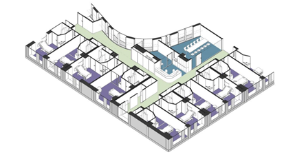 Ytre del av arbeidsstasjonen er åpen og fungerer som et henvendelsespunkt. Den er på ca. 10 m2, og har en fast arbeidsplass og 3 klinisk mobile arbeidsplasser. Bakre del av arbeidsstasjonen er skjermet og areal varierer mellom 15,3 til ca. 24 m2 avhengig av plassering i bygget. Den inneholder tre til fire arbeidsplasser.