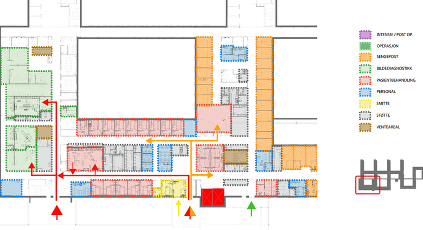 Figur viser en skisse fra 1.etg., der akuttmottaket er plassert, og pilene indikerer inngang til akuttmottak og bildediagnostikk, med krysningspunkter.