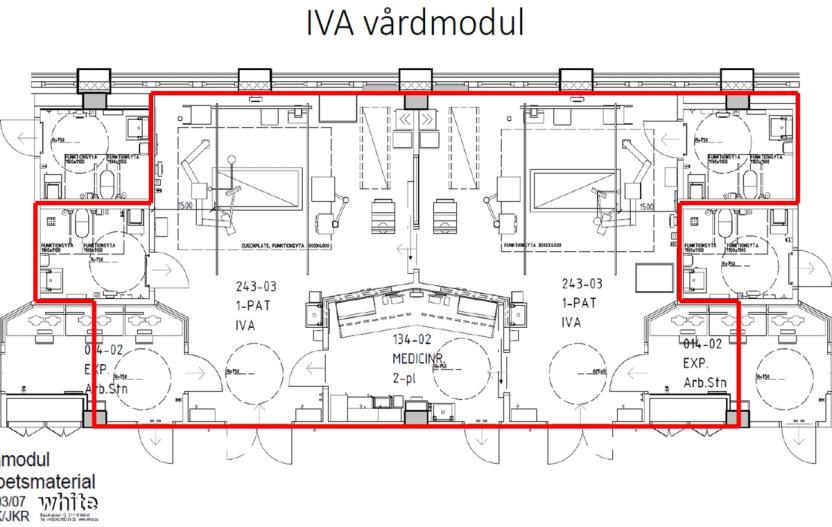I den nye intensivenheten i Malmø er IVA vårdmodul «byggestenen». Modulen består av to intensivrom med medisinrom, bad og teamarbeidsstasjon.
