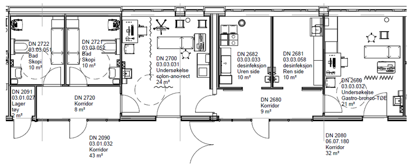 I tillegg ligger det et rom for cysto-, ano-, rektoskopi (22 m2), som har direkte tilgang til toalett på den andre siden av korridoren og nært desinfeksjonsrom (ikke vist i figuren).