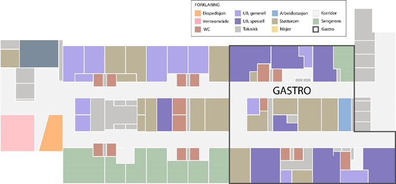 Dobbelkorridorløsning med 5 gastro endoskopilabber og 1 bronko endoskopi lab. Felles desinfeksjonsrom ligger i midtsonen oppdelt i urent rom og rent rom. Skopvaskemaskinene åpnes på begge sider – urene skop inn på uren side og rene skop tas ut på ren side. Skap til rene skop er i rent desinfeksjonsrom og kan brukes av alle endoskopirommene. Arbeidsrom ligger i området, bla. arbeidsbase med inngang fra begge korridorer. Konsultasjonsrom ligger i annen del av sykehuset