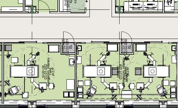 Intensivenheten i Haugesund har 3 tosengsrom, 5 ensengsrom, et kontaktsmitteisolat og et luftsmitteisolat. Ensengsrommene har kun dør mot korridor. Arbeidsplass er plassert mot fasade både for ensengs- og tosengsrom.