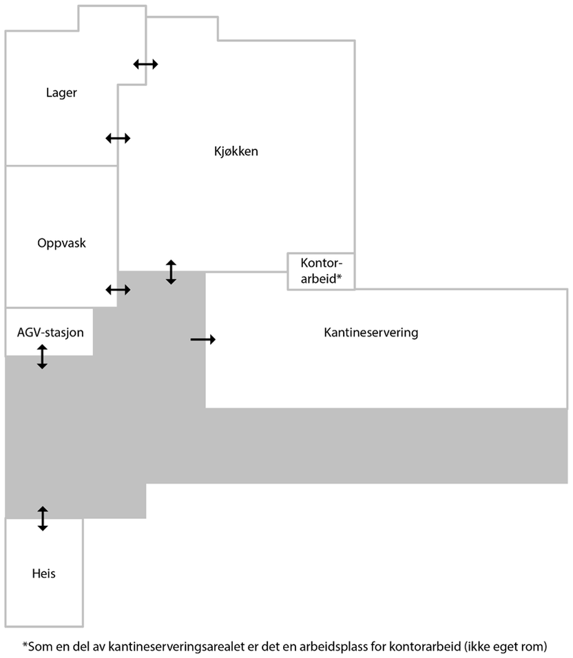 Sentralkjøkkenet med tilhørende arealer ved St. Olavs Hospital er prosjektert til ca. 880 m2. Nedenfor vises det en skisse basert på plantegning som viser flyt i sentralkjøkkenet.
