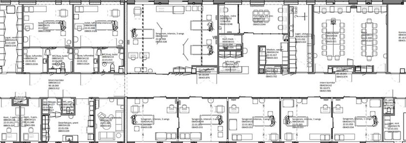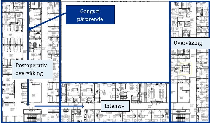 Plantegningenviser ingen adskilt tilgang til intensiv, besøkende må gå gjennom post operativ overvåking for å komme til intensiv. Det oppleves forstyrrende både for pasienter, besøkende og personalet.