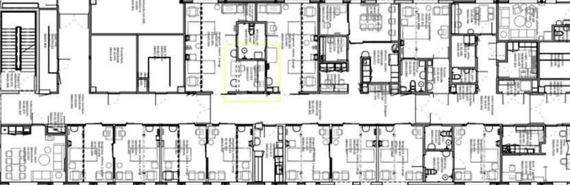 Intensivenheten er utformet med enkelkorridor løsning med støtterom og pasientrom på begge sider av korridor. Det ble planlagt glass i vegg og skyvedør mot korridor for å gi indirekte lys til korridor og arbeidsstasjon. Alle glass er frostet i ettertid for å skjerme innsyn til pasient. Korridorbredden er 242 cm, den oppleves smal når diverse utstyr, personell og pasient i seng skal transporteres, i tillegg til at den er uoversiktlig og lang.