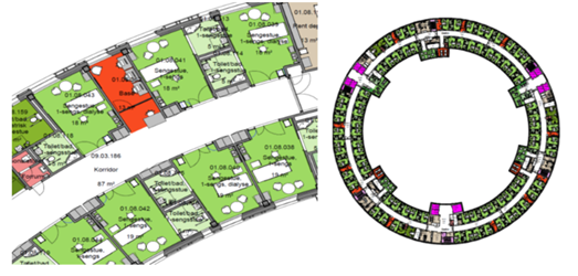 Den lille sirkelen er kvinne/barn, mens den store sirkelen er øvrige sengeområder. Sirklene er bygget oppå akuttbygget med akuttmottak, operasjon, intensiv m.m. Poliklinikkene er i eksisterende bygg (høyblokken).