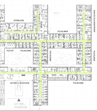 Poliklinikkene er inndelt i områder (grupper), eksempelvis for fagområdene hjertemedisin, ortopedi, urologi og gynekologi. Det er et eget område for dagbehandling (dialyse og kjemoterapi) lengst inn i området, mot nord.