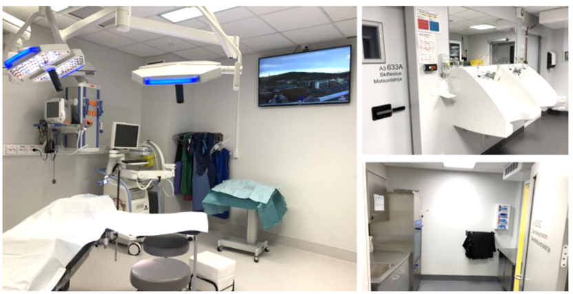 - Operasjonsrommene har operasjons-stuestandard med luftgjennom-strømning på 100cfu. Det er gjennomstikkskap mellom rommene.
