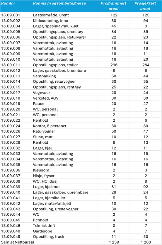 Romprogrammet i Tabell 2 viser både programmert og prosjektert areal. Man kan se at det er betydelige arealer til lasteområder og oppstilling av vogner. VDS i dette eksemplet inneholder også avfallssentral med kildesortering[1].