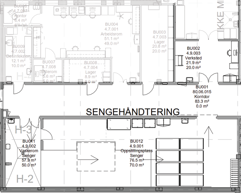 Sengevasksentralen er plassert på plan U1 sammen med andre forsyningsfunksjoner. Manuell transport av senger mellom sengevasksentralen og avdelinger via korridor og heis. Sengeverksstedet er plassert sammen med andre verksteder, rett over korridoren fra sengevasksentralen.