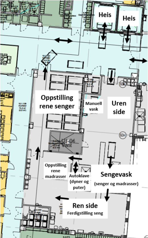 Sengevasksentralen er plassert på plan 1 sammen med andre forsyningsfunksjoner. Manuell transport av senger mellom sengevasksentralen og avdelinger via korridor og heis.