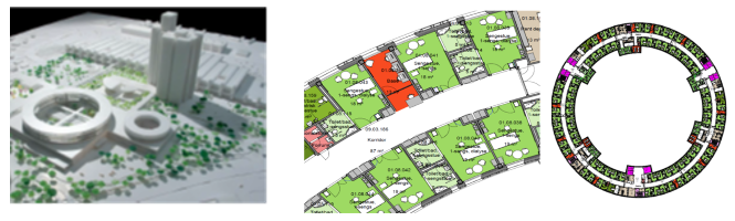 Herlev hospital er et eksempel på plassering av sengeområder oppå en base, men i et sirkulært bygg. Det nye akuttbygget og Kvinne-barn-senteret ved Herlev hospital i København utgjør en utvidelse på ca. 60 000m2.
