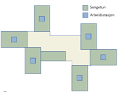 Hvert sengeområde med tre enheter har tre arbeidsstasjoner, et tverrfaglig arbeidsrom med tre arbeidsplasser, et enmanns- og et tomannskontor, pauserom, samtalerom og stillerom, samt et sentralt plassert desinfeksjonsrom, lager rent og lager utstyr.