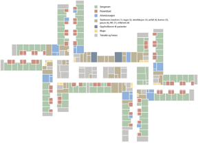 Sengerommene er desentralt plassert ytterst i de tre fløyene, skjermet fra den aktive midtsonen. Fem til sju av sengerommene per sengeområde er kontaktsmitteisolater, noen med dekontaminator i bad.