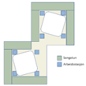 Figuren over viser at avrunding av hjørner hvor arbeidsstasjon er plassert, kan gi siktlinjer i to korridorer, og mulighet for oversikt over flere sengerom enn i de andre løsningene.