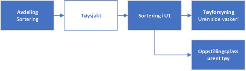 - Tøysjakt, sortering i bunn av tøysjakt: fordeling av hva som skal til internt og eksternt vaskeri.