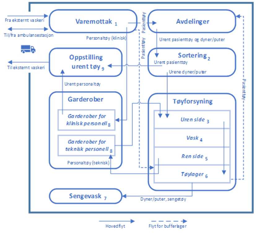 Beskrivelse av vareflyt for urent pasienttøy og urene dyner og puter (se også figuren nedenfor):
