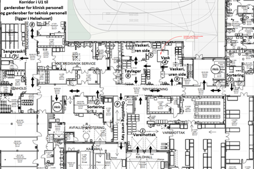 Det er planlagt med interne vaskeri som skal ivareta vask av dyner/puter og klær til teknisk- og ambulansepersonell. Tøyforsyningens arealer er plassert på plan U1.