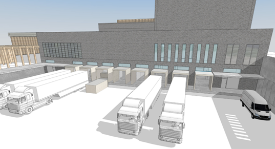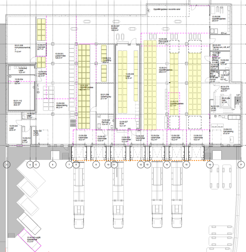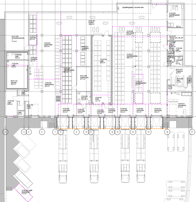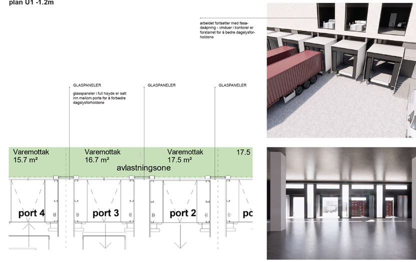 Figuren nedenfor viser varemottaket og portene mer detaljert. I et stort og dypt areal som dette er, så er glasspanelene mellom portene en smart detalj for å slippe inn dagslyset og dermed bidra til et bedra fysisk arbeidsmiljø.