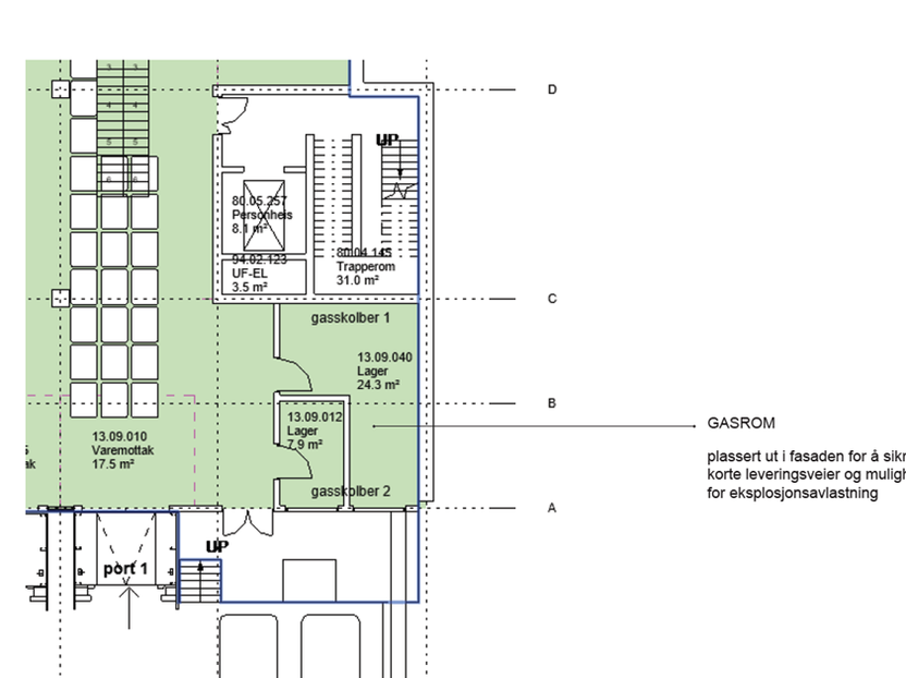 Figuren nedenfor viser lager for gasser brennbare og ikke-brennbare gaser som er plassert ut mot fasaden med lett tilgang fra rampe for inn-/utlevering.