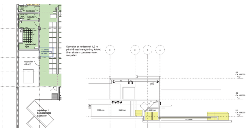 Figuren nedenfor viser plasseringen av dekontaminering av smitteavfallet. Skissen viser rommet ozonatoren er plassert i og hvordan avfallet etter behandling transporteres til container.