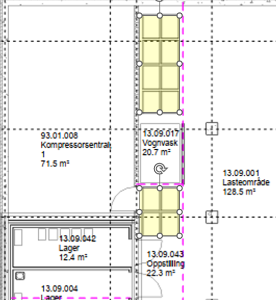Figuren nedenfor viser vognvask med oppstilling av urene og rene vogner. I en situasjon med flere enn 12 rene vogner så kan de benytte lagerareal som er avsatt til lager for elektrisk truck/sniler. Det er viktig å planlegge med slike buffersoner for å ha en fleksibilitet i driften.