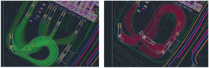 I figuren nedenfor vises sporingsanalyse som er gjort for å sikre en tilfredsstillende trafikkavvikling på området. Sporingsanalysen medvirker til å sikre at trafikkavviklingen inne på området kan gjennomføres på en forsvarlig måte. I de to eksemplene i figuren nedenfor vises det at kjøretøyene (her en semitrailer på 17,5 m) kan kjøre ned rampen og svinge samtidig med at den kan rygge seg til og nå alle portene i VDS. Likeså viser sporingsanalysen til høyre (lilla farge) at tankbilen kan plassere seg på plass for å levere gasser til tankene, men at det krever at det ikke står biler som leverer til de to portene som er lengst til høyre i skissen. Dette er viktige momenter som må tas hensyn til i planlegging av drift og trafikkavvikling i varegården.