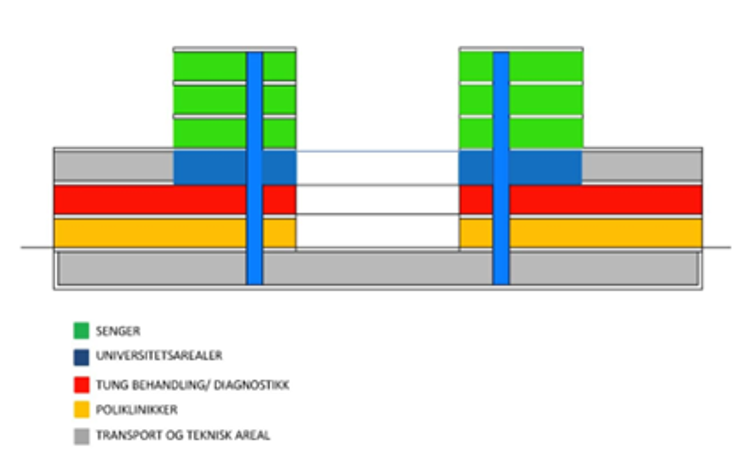 St. Olavs hospital er organisert som en klinisk sentermodell. Som prinsippskissen viser er poliklinikk- og dagområder plassert på bakkeplan, med tilhørende sengeområde oppover i bygget.