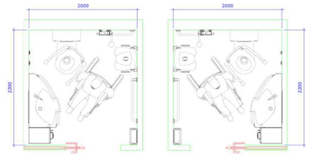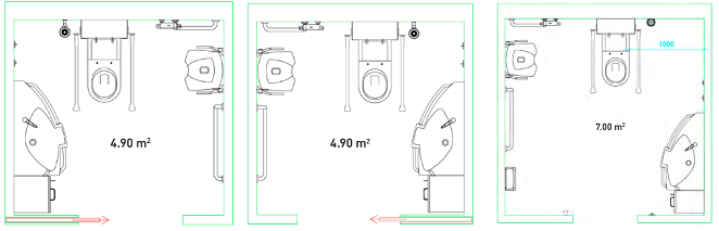 Illustrasjonene under viser to like store bad med rullestoltilgjengelighet på henholdsvis høyre og venstre side av toalettet. En slik løsning vil være tilfredsstillende i de fleste sengeområder. Rapporten sier at de ikke fant at pasienter ikke kunne bruke baderom med tilgang bare på den ene siden av toalettet.