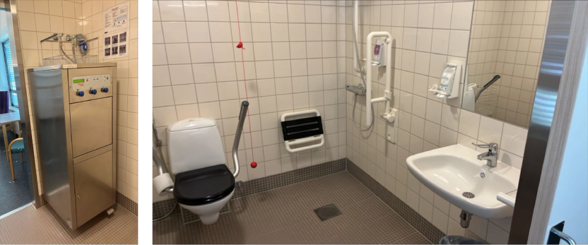 Badet har hev/senk servant og WC, og støttehåndtak er plassert hensiktsmessig i rommet, slik at pasienten selv kan forflytte seg mellom WC, servant og dusj.