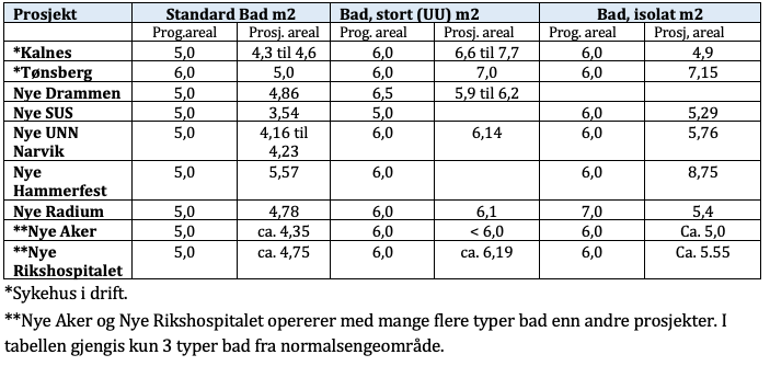 Tabellen under viser prosjektert areal for bad (WC/dusj) i sykehus i drift og utvalgte sykehusprosjekter med godkjent forprosjekt. Alle prosjekt har fått godkjent løsningen for bad unntatt Nye Aker og RH som p.t. er i dialog med Arbeidstilsynet.