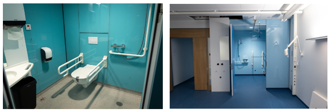 Figuren over viser at det er det brukt HC-tilpasset WC og servant, men konseptet fra Bergensbadet for økt selvhjulpenhet er ikke fulgt helt ut. WC er i en fast høyde (ikke regulerbart). Avstand WC og servant kan gi utfordringer når pasienten strekker seg mot servant for å løfte seg opp. Døren til det store badet er pivothengslet, slik at døren kan åpnes mer enn tradisjonelt hengslede dører. Dette gir god tilgang for rullestol og mobile pasientløftere.