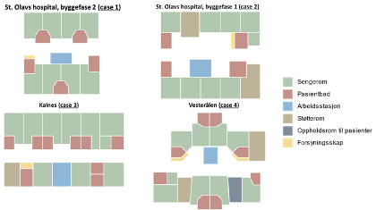 Det er 8 sengerom på hvert tun, unntatt Kalnes hvor det er 9 sengerom på et tun. På St. Olavs hospital fase 1 og 2 og Vesterålen er arbeidsstasjonene plassert ut i korridor med arbeidsrom/grupperom på motsatt side av korridor. På Kalnes er arbeidsstasjon med indre sone plassert bak den ytre og på linje med sengerommene. Plassering og antall bad på de ulike tunene er forskjellig. I Vesterålen og på Kalnes er det bad knyttet til hvert sengerom, men på St. Olavs hospital deler 2 pasienter ett bad unntatt det store senge-rommet.