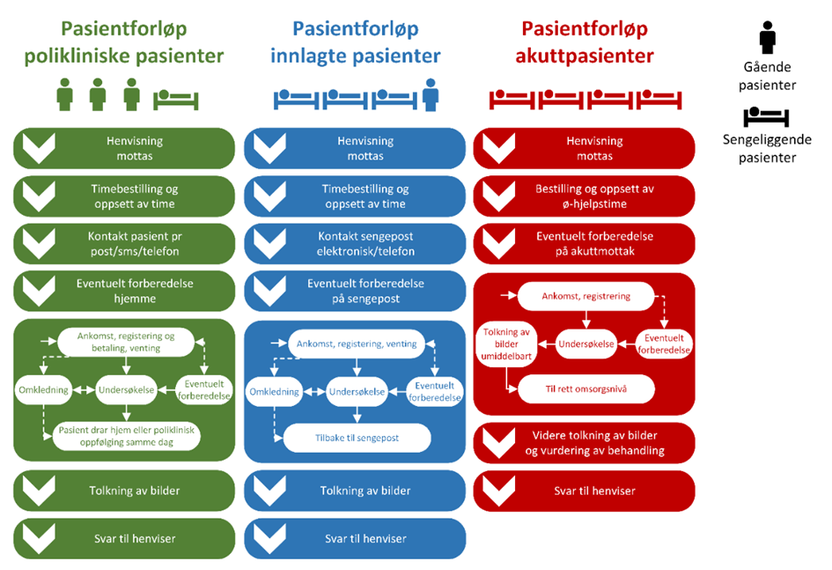 Figur 1 viser generiske forløp for pasienter som henvises til planlagte og akutte undersøkelser i en bildediagnostisk enhet.
