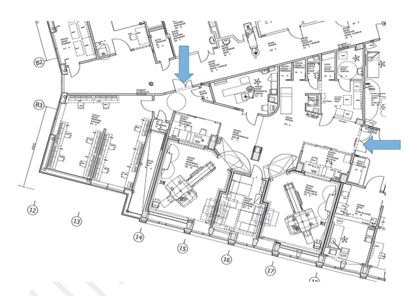 Figur 1. Eksempel på MR sone, hentet fra Nordlandssykehuset i Bodø. MR maskinene er plassert slik at det er enkelt å overvåke pasienten under undersøkelsen. Blå pil indikerer adgangskontrollert dør inn til MR sonen. (Kilde: Skisse fra Nordlandsykehuset Bodø