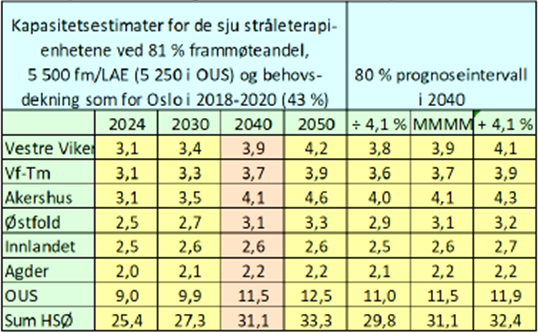 I tabellen nedenfor vises beregnet kapasitet for stråleterapi i Helse Sør-Øst for årene 2024, 2030, 2040 og 2050, med utgangspunkt i behandlingsframmøter perioden 2018-2020. I beregningene for OUS inngår bydelene Alna, Stovner og Grorud, da aktiviteten er planlagt overført fra Akershus universitetssykehus (Ahus).