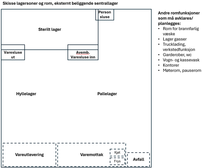 Hvilke lagersoner og lagerrom som planlegges for sentrallager kan variere, med grunnlag i hvilke uttakskvantumenheter sentrallageret plukker og leverer av sterile forbruksvarer.