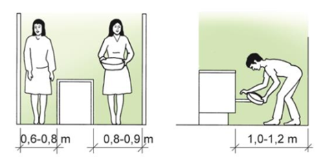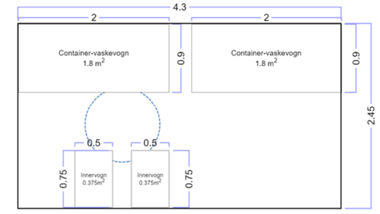 Ifølge SINTEF Byggforsk (2017) kreves det en bredde på 1 - 1.2 m for at en vanlig person skal kunne bøye seg ned, hente ut og legge fra seg utstyr, se illustrasjon i Fig. 22C. Diameter på 1m i bevegelses-rekkevidde er brukt for å sikre god plass og korrekt helsemessig utførelse av løftet. I tillegg til arealet for en containervaskevogn på 1.8 m2 er det satt av plass til to innervogner på 0.375m2. Cellen er arealberegnet for to rack/vogner. Det vil i noen tilfeller være mer hensiktsmessig å redusere antallet til én rack/vogn og kanskje spesielt i mindre sykehus hvor det er mindre volumer gjennom sterilsentralen.