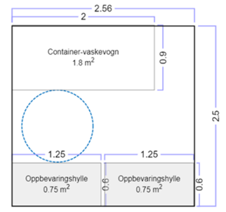 Figuren viser et arbeidsområde i tilknytning vognvaskemaskinen. Her settes containere sammen og plasseres i oppbevaringshyller. Slik det praktiseres på St. Olavs er hyllene sortert etter avdeling, hvor hver avdeling har én oppbevaringshylle (Berg, 2023). De opplever at dette ikke er tilstrekkelig når aktiviteten er på topp og har en reserveløsning med å plassere containere i innervogner. Det er derfor viktig å settes av tilstrekkelig areal og oppskalere antall oppbevaringshyller etter behov. Andre løsninger for oppbevaring kan også implementeres.