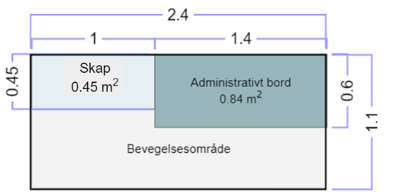 Dette er en administrativ celle hvor det oppbevares permer og kataloger med rutiner og informasjon som skal være lett tilgjengelig for de ansatte på jobb. Cellen krever ikke et stort areal og kan med fordel plasseres inntil en vegg slik at kataloger kan henges opp på veggen for lettere bruk. Det er satt av 0.5 m med bevegelsesareal bak bordet. Det kan legges opp til at det foregår transport bak cellen, nettopp fordi dette ikke er en fast arbeidsplass for de ansatte, og det er ingen som skal stå her over lengre tid. Figuren illustrerer arbeidscellen med dimensjoner.
