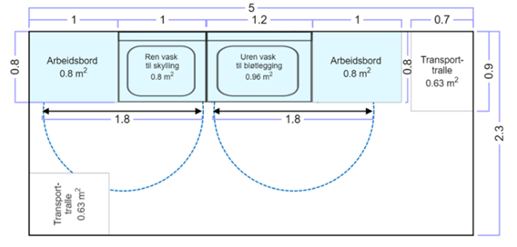 Denne løsningen inneholder et sett med vaskekummer, samt tilhørende arbeidsbord. Uren side til høyre i cellen. Vasken er dimensjonert med en bredde på 1m, hvor den totale basen til vasken blir 1.2m bred. Begrunnelse for bredden er at det skal være plass til å bløtlegge lengre instrumenter. Den rene vasken til venstre brukes til skylling av instrumenter og stiller ikke krav til samme bredde, vasken er derfor dimensjonert til 0.8m, som gir en base på 1m i bredden. Tilhørende arbeidsbord er dimensjonert til 1x 0.8m. Arealet begrunnes med at det skal være plass til rister og utstyr på arbeidsbordene, men siden hoveddelen av arbeidet vil foregå i vaskekummen stilles det ikke like stort krav til lengden på arbeidsbordene. Ved behov for andre mål på vask eller arbeidsbenk kan dette enkelt justeres, og vil kun påvirke cellens bredde, ikke arealbehovet bakover. Det er tegnet inn plass til minst 2 transporttraller slik at en kan ha én ren og én uren tralle. Transporttrallen til høyre i cellen, er tegnet inn som et eksempel på at en bør kunne plassere instrumenter i nærheten av arbeidsbordet, for å tilrettelegge for manuelt løft nært kroppen 1Systematic Layout Planning, s.l.: Management and industrial research publications, Fourth edition. SCRIBDhttps://www.scribd.com/document/397449753/Systematic-Layout-Planning-Richard-Muther. Det kan også løses på andre måter, eksempelvis å kombinere denne plassen med retur-slusen fra ren sone, slik at arbeidsbordet fra retursonen får plass der det her er tegnet inn en transporttralle. Poenget er at det må avsettes et areal for instrumenter tilhørende minimum én vaskeinnsats.