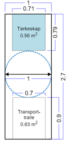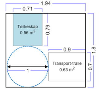 Det er illustrert to alternativer til oppsett, der forskjellen på cellene er plasseringen av transporttrallen i forhold til tørkeskapet. Ved alternativet illustrert i figur med 3.49m2 er det fritt areal i høyre hjørne som kan tilsvarer plass til et ekstra tørkeskap. I figur med areal på 2.7 m2, er det ikke noe fritt areal. Begge cellene kan oppskaleres etter behov. Cellene er dimensjonert med en bevegelsesrekkevidde for den ansatte på 1 m, da dette er anbefalt rekkevidde ved løft (SINTEF Byggforsk, 2017).