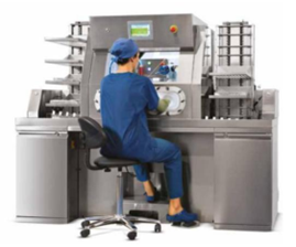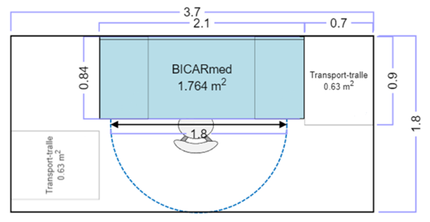 Der BICARmed rengjøringssystem benyttes vil cellen utformes med likt oppsett, men det vil ikke være behov for arbeidsbord på hver side da dette er en del av selve maskinen. viser dimensjonering av arbeidscellen og i Bildet under illustreres et BICARmed system. Det vil fortsatt være behov for å kunne kjøre en transporttralle inntil på uren side, på illustrasjonens høyre side, men med samme argument som nevnt tidligere kan denne substitueres med en annen løsning. Eksempelvis en oppbevaringshylle der ristene med utstyret kan plasseres før rengjøring. En standard oppbevaringshylle på 0.75 m2 vil være tilstrekkelig. Det er også satt av plass til en transporttralle på ren side for å frakte bort de rengjorte instrumentene. Betjening av BICARmed gjøres sittende og krever mindre bevegelsesfrihet bakover. Cellen kan derfor avgrenses til en rekkevidde på 1.8m. På grunn av BICARmed sin virkemåte vil det heller ikke kreve at arbeiderne bruker noe ekstra verneutstyr som ved vanlig manuell vask, så det vil være mindre behov for forbruksmateriale.