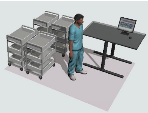 Flyten av innervogner er illustrert i cellen og tilsvarende areal bør settes av for å sikre fremkommelighet ut av sterilsentralen. Bevegelsesområdet bak arbeidsbordet bør opprettholdes for å unngå oppsamling av andre elementer i cellen. Ekstra arkivskap vil være vesentlig å sette av plass til. De er foreløpig ikke illustrert i cellen, men kan enkelt tilføyes etter behov. De følger standard for liten oppbevaringshylle, og bidrar til å holde cellen ryddig og oversiktlig.