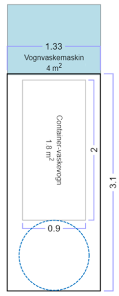 Flyten gjennom vognvaskemaskinen består i hovedsak av enhetene: innervogner, AGV/AMR-vogner og racks/stativer med containere. Valg av layout bestemmer om cellen tilhører ren eller steril sone. Området er ikke sterilt, men en ren gang (Berg, 2023). I illustrasjonen er det tatt utgangspunkt i den lengste enheten, som er en containervaskevogn. Området må derfor være minst 2 m i lengde, i tillegg er det lagt inn bevegelsesområde på 1 m for operatør. Det er også lagt inn en klaring på 0,1 m mellom vogn og vaskemaskin. Dermed måler cellen 3.1 m x 1.33 m.