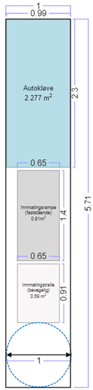 Autoklaven måler 0.99 m x 2.3 m. Dette arealet vil deles likt mellom ren og steril sone siden autoklaven er plassert i veggen mellom sonene.