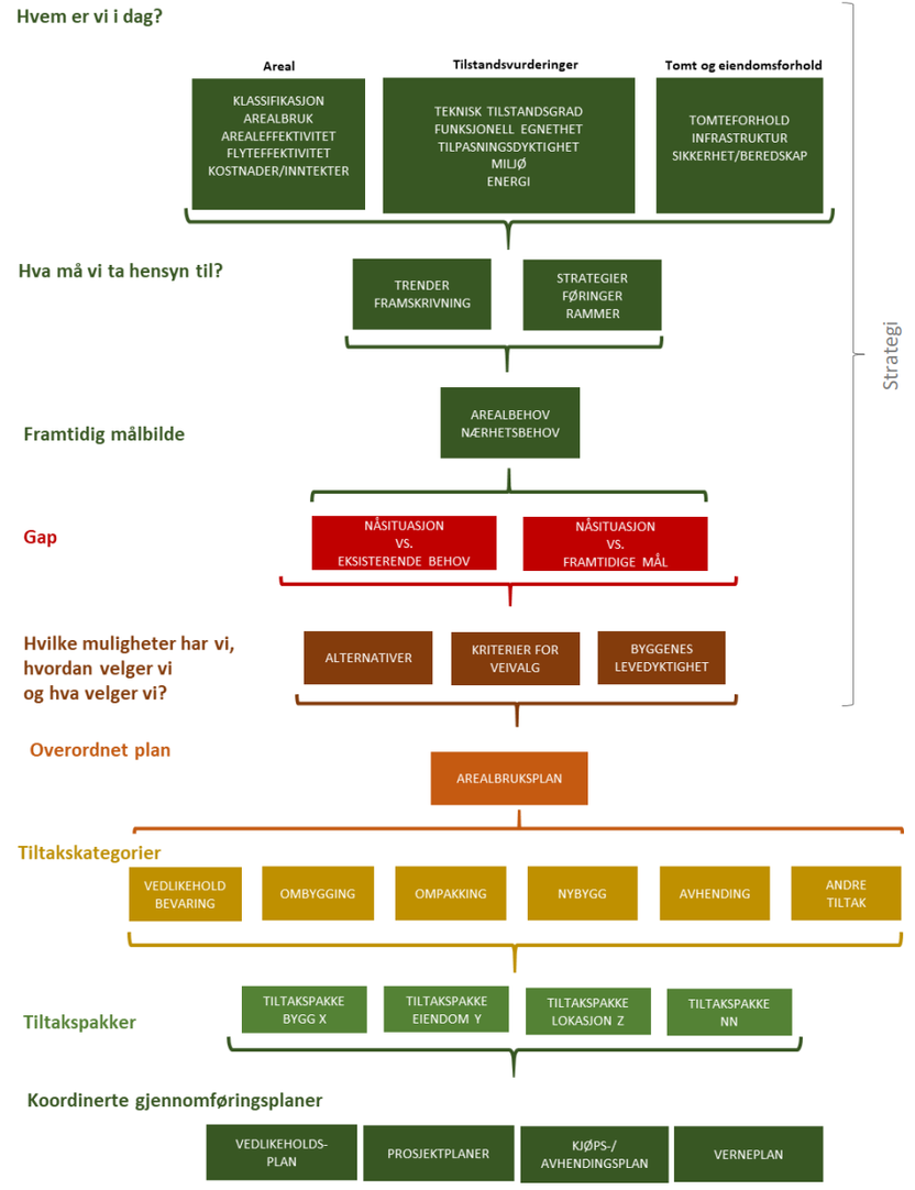 I figur 1 vises en skjematisk oversikt over anbefalt arbeidsmetodikk for utvikling og forvaltning av bygg og eiendom. Figuren tar utgangspunkt i Veileder for arbeidet med utviklingsplaner og resulterer i konkrete gjennomføringsplaner, slik dette er beskrevet i denne veilederen: