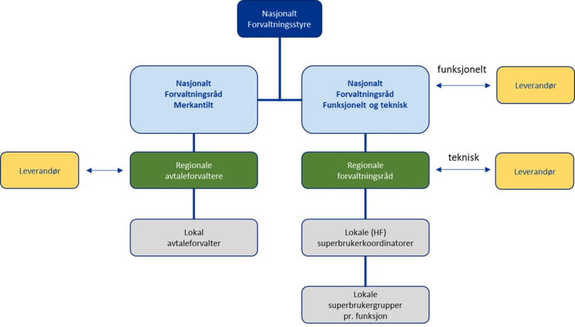 Ansvar for de nasjonale forvaltningsoppgavene er fordelt på et nasjonalt forvaltningsstyre og to underliggende forvaltningsråd, ett for merkantile oppgaver og ett for øvrige funksjonelle og tekniske oppgaver. Da de fleste tekniske spørsmål vil være konsekvenser av endringer i funksjon, vil den tekniske forvaltningen legges opp som en arena sammen med den funksjonelle.
