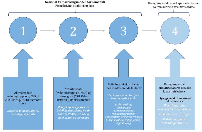 Nedenfor presenteres alle tre trinn i framskriving av aktivitet ved bruk av den nasjonale modellen for somatisk sektor og beregning av kliniske kapasiteter basert på den framskrevne aktiviteten i trinn 4.