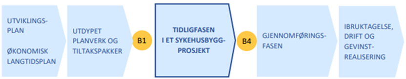 Oppbygging av Byggveileder følger VEILEDER FOR TIDLIGFASEN I SYKEHUSBYGGPROSJEKTER, som omfatter de tre planfasene; prosjektinnramming, konseptfase og forprosjektfase. Det legges til grunn at tiltak/prosjektet er forankret i helseforetakets utviklingsplan.12